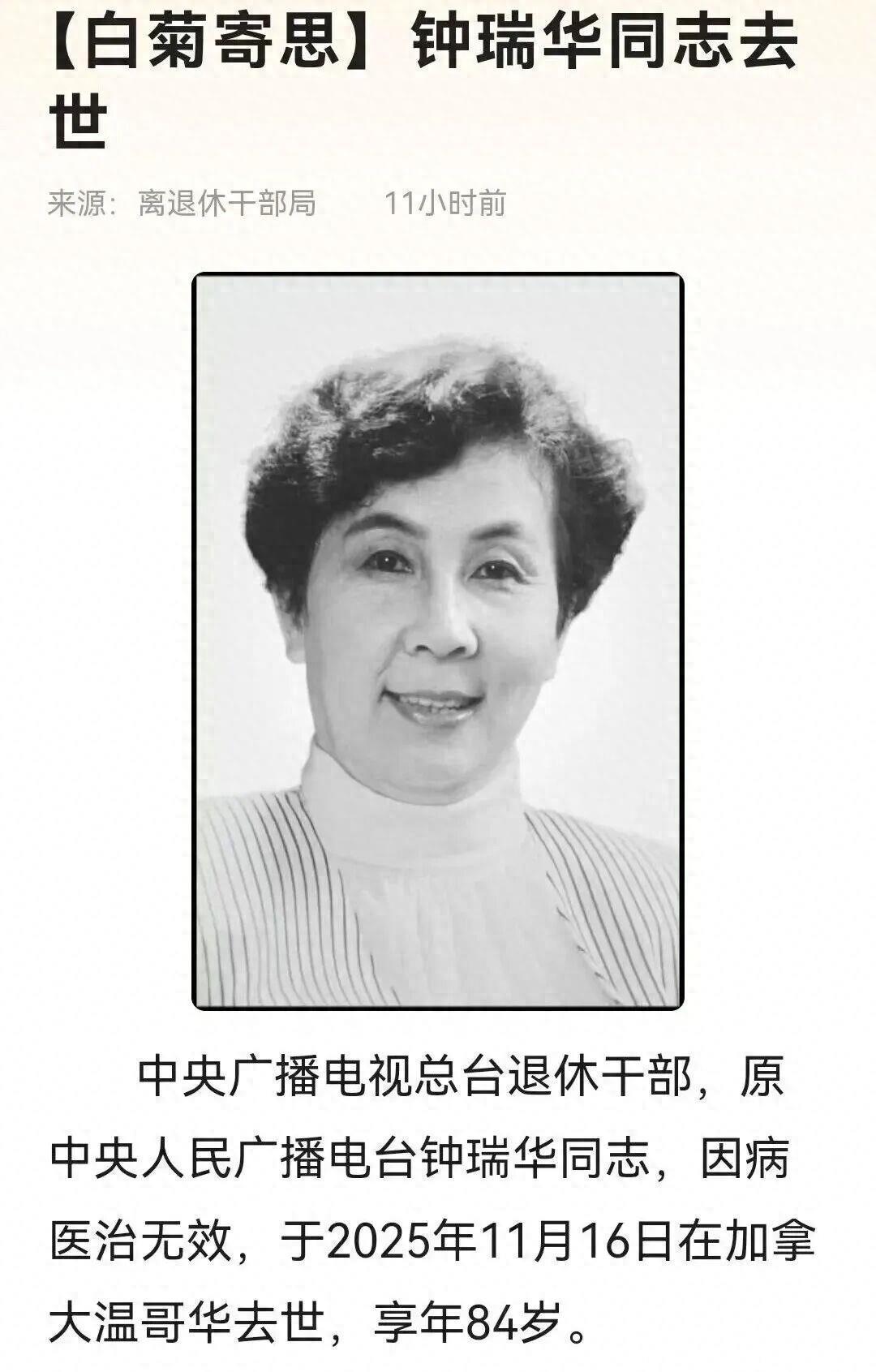 老一辈的声音,总能让人一下子回到过去。钟瑞,这个名字对年轻点的观众可能有点陌生,但提起《新闻和报纸摘要》里那清亮沉稳的播报声,不少人耳朵立马就竖起来了。她不是流量明星,却用几十年如一日的坚守,在无数个清晨敲开了中国家庭的窗。2024��日,她在加拿大温哥华离世,享�岁。消息沉了将近一个月,直��日才被一个央广退休干部的社交媒体账号悄悄带出来。没有官方通告,没有追悼仪式,就这么静悄悄地走了。